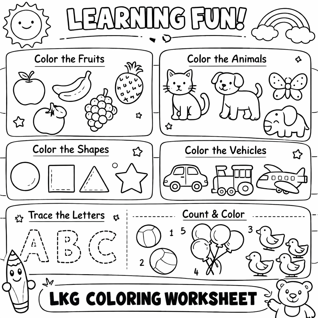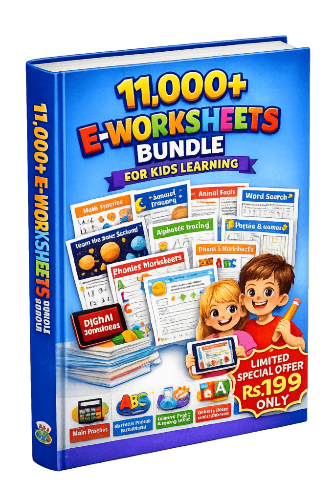 This E-Worksheet Bundle is specially designed for children aged 2 to 7 years. It includes activities suitable for Nursery, LKG, UKG, and early primary levels. The worksheets gradually increase in difficulty to match different learning stages.